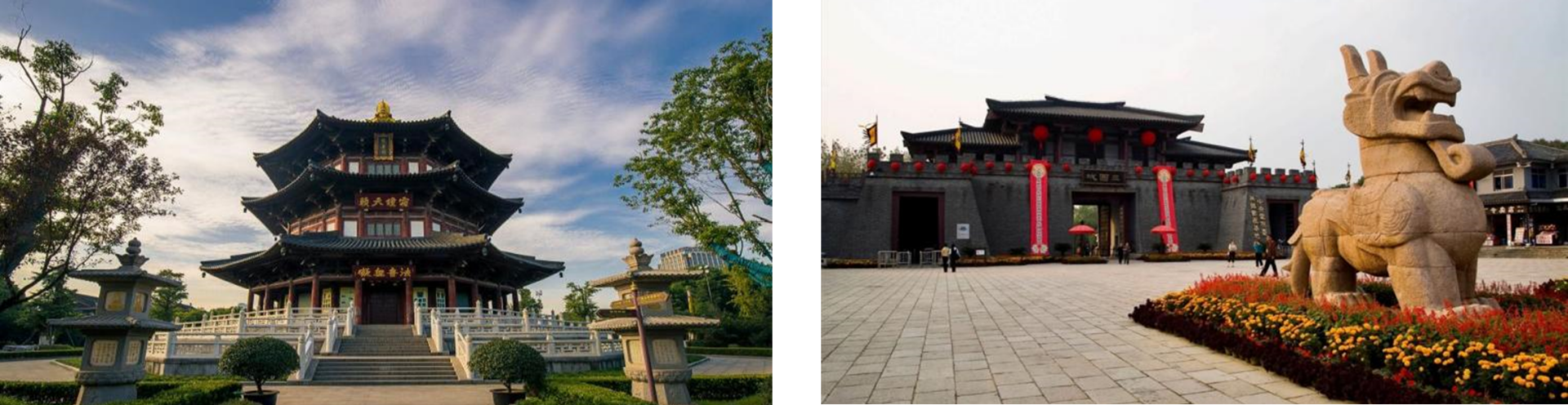 Phim trường cũng được chia thành nhiều khu vực khác nhau theo từng thời điểm lịch sử, như: đời Hán có cung điện Ngô Vương, Hán đỉnh, Tào doanh, Thủy trại…; đời Đường có Ngự hoa viên, Thẩm Hương đình, hồ Thanh Hoa…; đời Tống có Hoàng cung, chùa Đại tướng quốc, thủy trại Lương Sơn Bạc… Ngoài ra còn có các công trình kiến trúc theo thời triều Minh, Thanh và cả khu Tứ hợp viện Bắc Kinh, phố cổ Thượng Hải…, tất cả đều được dựng giống như thật và vô cùng sống động.